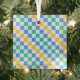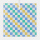 A colorful checkered pattern with alternating blue, green, and yellow squares on a white background. The design is vibrant and geometric, creating a playful tone.