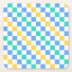 A colorful checkered pattern with alternating blue, green, and yellow squares on a white background. The design is vibrant and geometric, creating a playful tone.