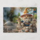 Niedliches Bild eines Strandgnom, der auf einem Sand-Thron am Strand mit Möwen herum sitzt.