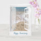 Strandherzen im Sand mit überwältigender Ozeansurfe und Blick auf das offene Fenster zum 35. Hochzeitstag Das Jubiläumsjahr kann geändert werden.