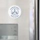 Stilvoll runder Kühlschrank Magnet mit Ihrem personalisierten Strandhaus, Seehaus, Familiennamen oder anderen Texten mit einem eigenen nautischen Bootanker, gekreuzten Rudern und Sternen in Weiß auf Marineblau oder wählen Sie Hintergrundfarben, um Ihre Einrichtung.