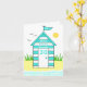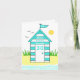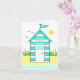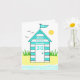 Strandhütte, hellblau und weiß gestrichen, stehend in den Sanddünen am Strand in der Sommersonne. Anpassbare Geburtsnachricht, Name und Alter.
