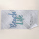 Beach Life mit Namen und Lage Strandtuch. Imitate wischen den Hintergrund aus Holz. Geben Sie Ihren Namen und Ihren Standort/das festgelegte Datum ein.