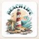 Beach House Décor. Illustration einer Strandszene mit Leuchtturm, Surfbrettern, Palmen und Delphin.