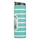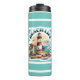 Thermalwasserflasche von Beach Life. Illustration einer Strandszene mit Leuchtturm, Surfbrettern, Palmen und Delphin.