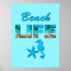 Poster mit der Beschriftung "Beach Life" mit dem Bild eines Sandstrandes und Palmen, ein Seepferd und Seesterne