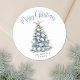 Celebrate in sunny style with this festive round sticker, perfect for your tropical holiday celebration. A large Christmas tree made of beach shells, starfish, and coral sits in the center, bringing a fun and whimsical coastal vibe to your event. The design features a teal blue and tan color palette that captures the feel of a beachy Christmas.