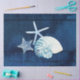 "Beach Ocean Muscheln Seashells Navy Blue Tissue Paper, schwer für Decodierung oder Geschenkverpackung." Ein paar schöne Seesterne und eine Nautilus-Muschel über einem marineblau-blauen Holzboden wurden von Audrey Jeanne Roberts, einem international anerkannten Künstler und Designer, in Aquarellen handgemalt