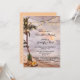 Romantische Probe Dinner Einladung mit einem tropischen Strand mit Palmen bei Sonnenuntergang. Die Bäume sind mit festlichen Saitenlichtern dekoriert und bieten Ananas und Blume an ihren Wurzeln. Schöne für einen Strand oder eine Destination Feier.