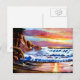 Malerei eines Strandes im Morgengrauen mit kleinen Wellen und Möwen, die im farbenprächtigen rosa und orangefarbenen Himmel fliegen.