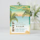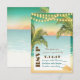 Palmen und Saitenlichter umrahmen den Sonnenuntergang und das sandige Ufer dieser schönen RSVP-Karte für die Hochzeit am Strand. Passen Sie den modernen, stilvollen Text auf der Vorderseite mit Ihren Hochzeitsinformationen an.