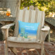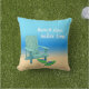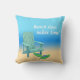 Nichts sagt Sommer wie die coolen Farben und lustige Grafiken dieses Kissens. Die Hintergrundschicht hat eine weiche Blues und ein sandiges Beige. Schicht 2 hat einen einladenden Aderrondack-Stuhl, mit einem Paar Flip Flops, die Sie bitten, sich zu setzen, zu entspannen und den Strand zu genießen. Die Rückseite des Kissens weist ein Wiederholmuster der Flip-Flops über den Hintergrundfarben auf.