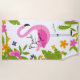Hier ist ein helles und buntes Badetuch, das erklärt, es sei "Beach Time" und hat auch Ihren Namen darauf. Das zentrale Bild ist ein großer rosa Flamingo. Der Flamingo ist mit tropischen Blätter, Blume, einem rosa Papagei und sogar einem Kakteen gerahmt. Die verwendeten Farben sind grün, gold und rosa. Alles ist auf einem weißen Hintergrund platziert.