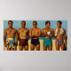 Poster mit einer Vintagen Abbildung der 50er Jahre von Männern in Badebekleidung am Strand. Retro cool!