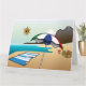 Eine coole, kleine Strandlandschaft mit gestreiften Stranddecken und Regenschirmen, Sandpail und Schaufel, Sandburg und Surfbrett.