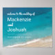 Dunkle aquamarine blaue Ozeanwellen, die auf einem hellen Sandstrand auf einem Hochzeitsschild mit eigens dafür angefertigten Namen und Hochzeitstermin auftauchen. Klicken Sie auf 'Weitere Anpassung', um erweiterte Editieroptionen wie das Ändern von Schriftart, Textfarbe und Hochzeitszeichendesign zu erhalten.