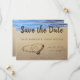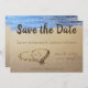 Für eine Hochzeit am Strand. Es hat die Initialen der Braut und des Bräutigams geschrieben in einem Herzen im Sand, am Strand. An der oberen Grenze sehen wir einen blauen Ozean Der Text ist braun, wie das Sandherz. Der Titel "Save the Date" wird in Skripten geschrieben. Das Strandherz-Foto liegt bei Petr Kratochvil von Public Domain Pictures und ist für kommerzielle Nutzung kostenlos.