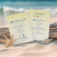 Einfache, moderne Strandwochenende Bachelorette Einladung mit individuellem Zeitplan am Rücken und farbenfrohe tropische Strandbilder, einfache blaue Kalligraphie-Schrift auf sonnigen gelben Hintergrund.