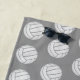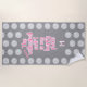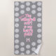 Dieses Strandtuch zum Thema Volleyball enthält den typischen Satz "Der Beachvolleyballplatz ist mein Happy Place" in Rosa und Weiß und eine maßgeschneiderte Spielermonogramm auf mittlerem grauem Hintergrund mit dem umgebenden kleinen weißen Volleyballmuster - von katz_d_zynes