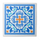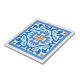 Diese schöne Fliese zeichnet sich durch ein exotisches spanisches Fliesendesign aus. Es hat ein orangefarbenes Kreuz auf einem blau-weißen Kaleidoskop-Hintergrund. Ein großartiger Rückzugsort für die Küche im Freien.