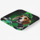 Ein wütender Freund hinter den Lenkern eines glänzenden grünen Fahrrads, das ein grünes Saint Patrick's Day Outfit trägt, das den Kopf dreht. Der Hund ist in einem festlichen Ensemble gekleidet, das mit einer grünen Bogen-Krawatte und einem passenden Oberhut versehen ist, der sich schmutzig über dem Kopf befindet. Das Outfit zeichnet sich durch die aufwändigen Entwürfe von Kleeblättern und Kobolden aus und macht deutlich, dass dieser Hund bereit ist, den St. Patrick's Day im Stil zu feiern.