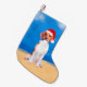 Beagle Hund sitzend am Weihnachtshut am Strand Kleiner Weihnachtsstrumpf