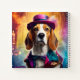 Ein spielerischer Beagle in einem pulsierenden, skurrilen Kostüm gekleidet vor einem glänzenden, magischen Hintergrund. Dieses bezaubernde Design ist perfekt für Tierfreunde.