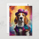 Ein spielerischer Beagle in einem pulsierenden, skurrilen Kostüm gekleidet vor einem glänzenden, magischen Hintergrund. Dieses bezaubernde Design ist perfekt für Tierfreunde.