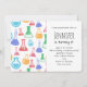 Einladung zum Geburtstag mit einem lustigen und farbenfrohen Muster. Wissenschaftler schauen mit Beakern und Flaschen verschiedener Formen und Größen in hellen, fröhlichen Farben.