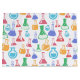 Geschenktasche mit einem lustigen und farbenfrohen Muster. Wissenschaftler schauen mit Beakern und Flaschen verschiedener Formen und Größen in hellen, fröhlichen Farben.