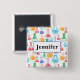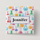Button mit einem lustigen und bunten Muster. Wissenschaftler schauen mit Beakern und Flaschen verschiedener Formen und Größen in hellen, fröhlichen Farben.
