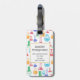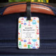 Ein Gepäckanhänger mit einem lustigen und farbenfrohen Muster. Wissenschaftler schauen mit Beakern und Flaschen verschiedener Formen und Größen in hellen, fröhlichen Farben.