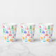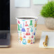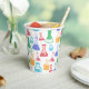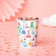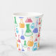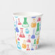Papier Becher mit einem lustigen und farbenfrohen Muster. Wissenschaftler schauen mit Beakern und Flaschen verschiedener Formen und Größen in hellen, fröhlichen Farben.