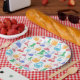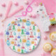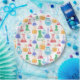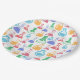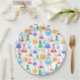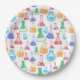Papier Teller mit einem lustigen und farbenfrohen Muster. Wissenschaftler schauen mit Beakern und Flaschen verschiedener Formen und Größen in hellen, fröhlichen Farben.
