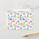 Eine Postkarte mit einem lustigen und farbenfrohen Muster. Wissenschaftler schauen mit Beakern und Flaschen verschiedener Formen und Größen in hellen, fröhlichen Farben.