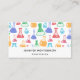 Visitenkarten mit einem lustigen und farbenfrohen Muster. Wissenschaftler schauen mit Beakern und Flaschen verschiedener Formen und Größen in hellen, fröhlichen Farben.