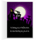Der Grimische Sensenmann in einem Friedhof mit Vollmond und lila Himmelshintergrund. Sehr lustiges und beängstigendes Design für Ihr Halloween Grußkartendesign.