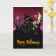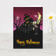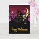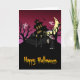 Illustration einer beängstigenden Halloween-Szene mit dem düsteren Sensenmann, der einen Schädel vor einem alten Spuk Haus hält.