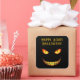 Beängstigende Augen und verrücktes Lächeln in Gelb und Orange auf schwarzem Hintergrund. Perfekter Aufkleber für jedes Geschenk zu Halloween Zeit.