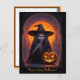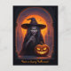 Halloween Postkarte mit einem Beängstigenden Halloween-Gruß. Auf der Vorderseite gibt es einen Beängstigenden Halloween Hexe und Crazy Smile Pumpkin.
