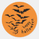 Diese beängstigenden Aufkleber haben schwarze Fledermäuse vor dunkelorangefarbenem Hintergrund und die Worte: glücklich halloween.