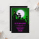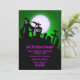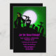 Der Grimische Sensenmann in einem Friedhof mit Vollmond und grünem Hintergrund. Sehr lustiges und beängstigendes Design für Ihre Halloween-Party-Einladung.