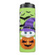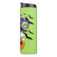 Beängstigender Kürbis mit einem weißen Kätzchen un Thermosbecher