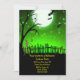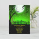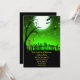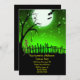 Ein beängstigendes Skelett in einem Friedhof mit Vollmond und grünem Himmelshintergrund. Sehr lustiges und beängstigendes Design für Ihre Halloween-Party-Einladungen.