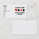 Eine Sound-Bridge/Duplikat-Bridge-Beratung finden Sie auf diesen individuell anpassbaren Visitenkarten mit den vier Kartenkarten-Anzügen zusammen mit dem Sprichwort "Keine Ansprüche bis Sie sicher wissen". Lassen Sie andere das nächste Mal, wenn sie Bridge mit Ihnen spielen - ob als Bridge-Partner oder als Bridge-Gegner - mit diesen denkwürdigen Bridge Sprichwort Visitenkarten machen!