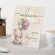 Ein niedlicher, kuscheliger Teddybär, ein Haufen Ballons, Schmetterlinge, flauschige Wolken und Ihre Details, zusammen mit dem Wort "Willkommen" an der Spitze, sind auf diesem Schild zu sehen. ÄNDERN SIE DIE GRÖSSE UND PASSEN SIE SICH IN unserer Kollektion.