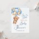 Dieses Design verfügt über einen freundlichen Teddy Bär mit blauem und cremefarbenem Ballon. Die Texte "Save the Date" und "Babydusche" sind im kalligraphischen Stil geschrieben.