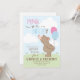 FRONT: Ein hübscher, von Hand gezeichnet Bär, der einen rosa und blauen Ballon hält. Frühling oder Sommer mit Gras, Himmel und Wolken. Personalisieren Sie Ihre Party-Daten. BACK: Eine Vignette eines Bären, der ein blaues Band trägt, und eines Mädchens, das eine Blume trägt, sitzt und berührt.