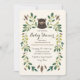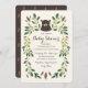 Woodland thematisierte Baby-Dusche Design von Shelby Allison mit einer Illustration von whimsical grünen Blumenmotiven rund um ein süßes Bärenkuppchen-Portrait.