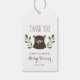 Woodland thematisierte Baby-Dusche Design von Shelby Allison mit einer Illustration von whimsical grünen Blumenmotiven rund um ein süßes Bärenkuppchen-Portrait.